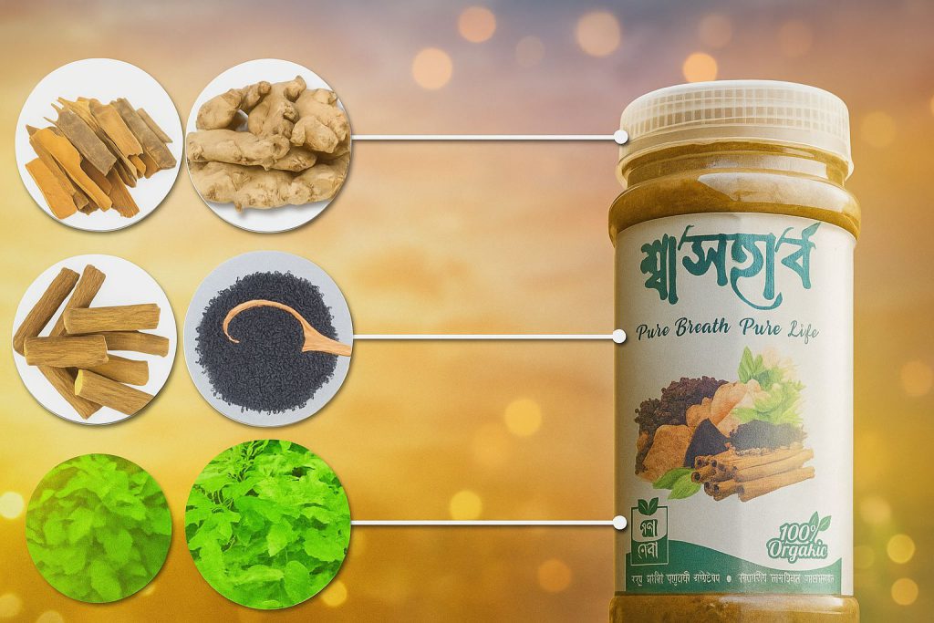 শ্বাসহার্বে ব্যবহার করা হয়েছে আদা, তুলসী, কালোজিরা, যষ্টিমধু এবং অন্যান্য প্রাকৃতিক উপাদান, যা আপনাকে দেয় পরিপূর্ণ আরাম এবং সুস্থতা।